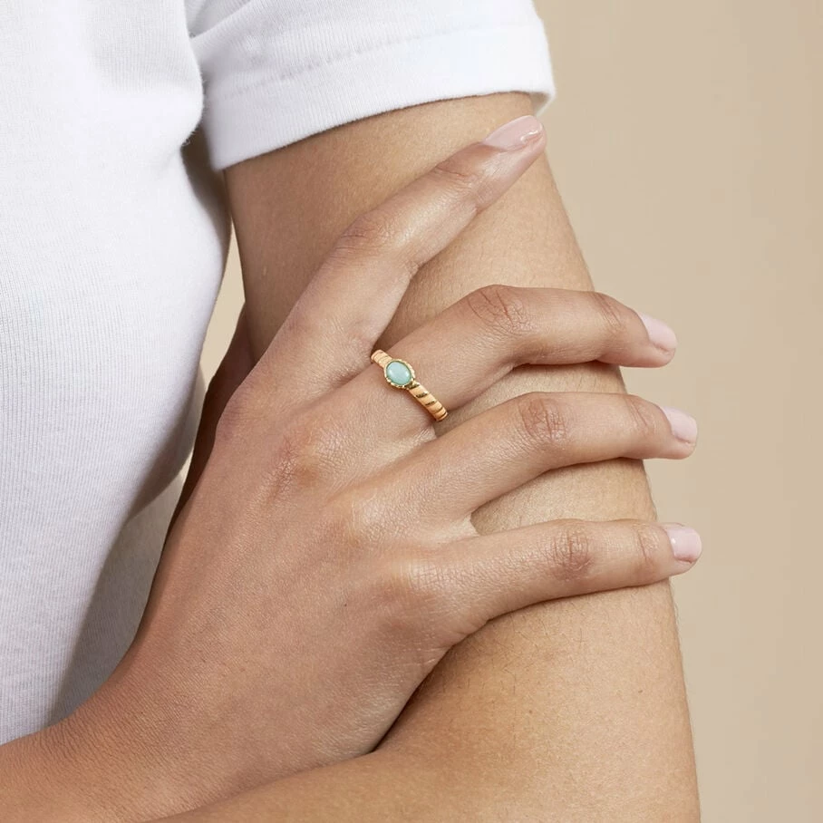 Bague fine, en laiton doré 750/1000, à la fois tressée et émaillée avec une pierre naturelle au centre.