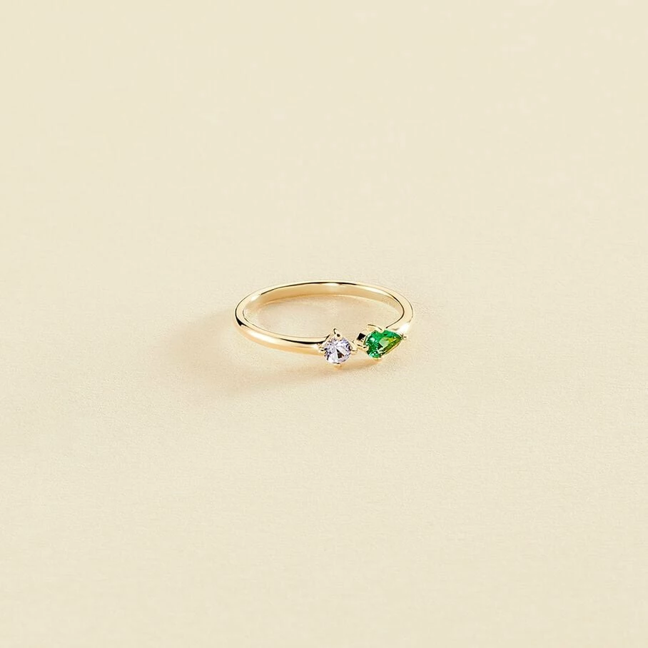 Bague fine, en argent véritable doré 750/1000, sertie de deux oxydes de zirconium de forme goutte et ronde