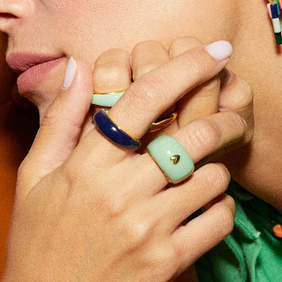 EXCLUSIVITE WEB : Bague, en laiton doré 750/1000 et acetate, l’insert intérieur en métal est gravé de petits coeurs.