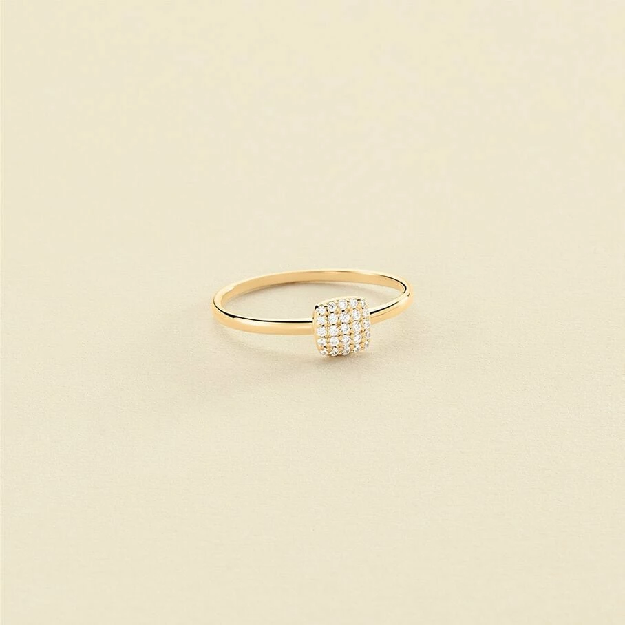 Bague fine, en argent véritable avec une couche d’or, avec un ornement de forme coussin et pavé d’oxydes de zirconium