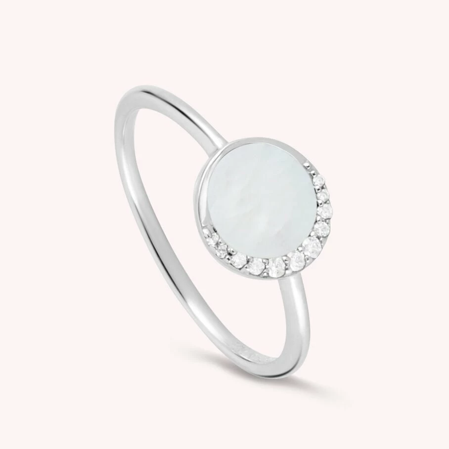 Bague, en argent véritable, ornée d’une pastille en nacre et d’un motif lune serti d’oxydes de zirconium