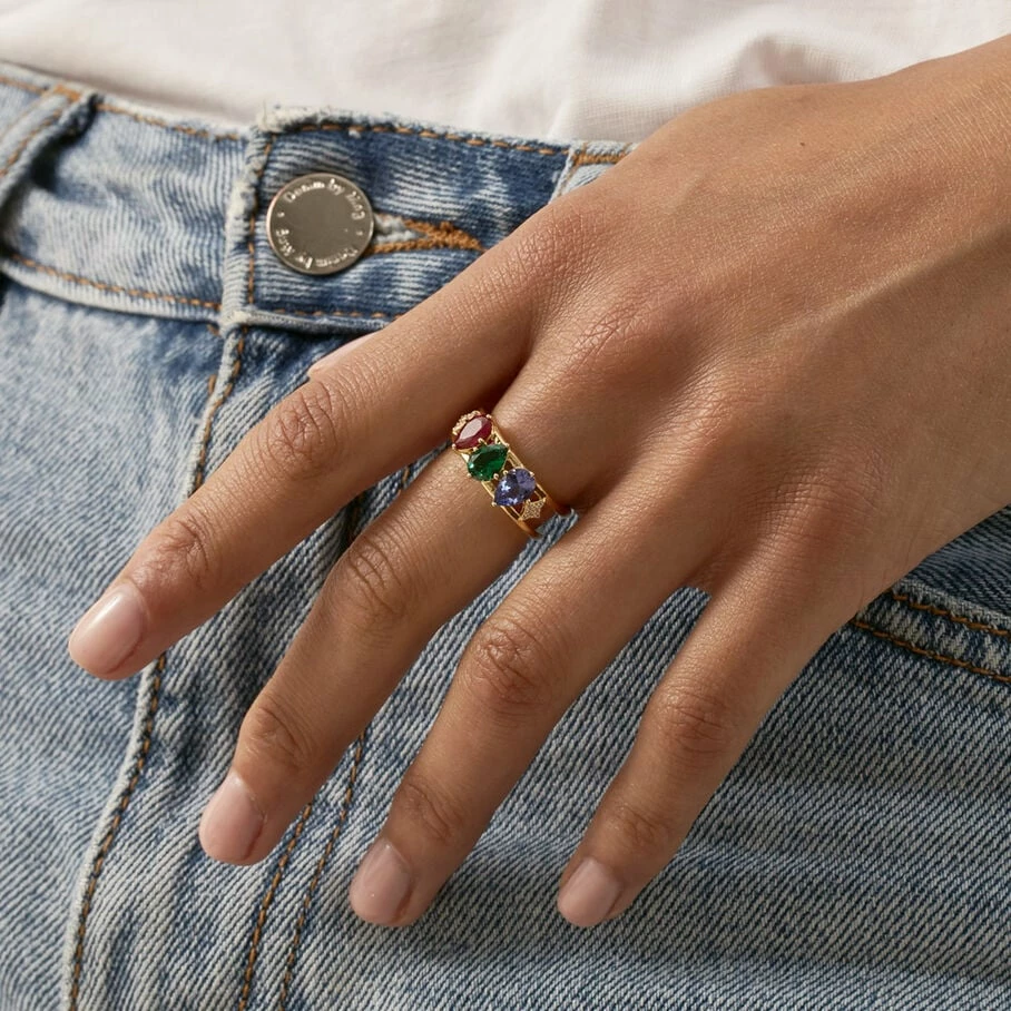Bague tonneau évidée, en argent véritable doré 750/1000, dont la partie centrale est ornée d’oxydes de zirconium multicolores