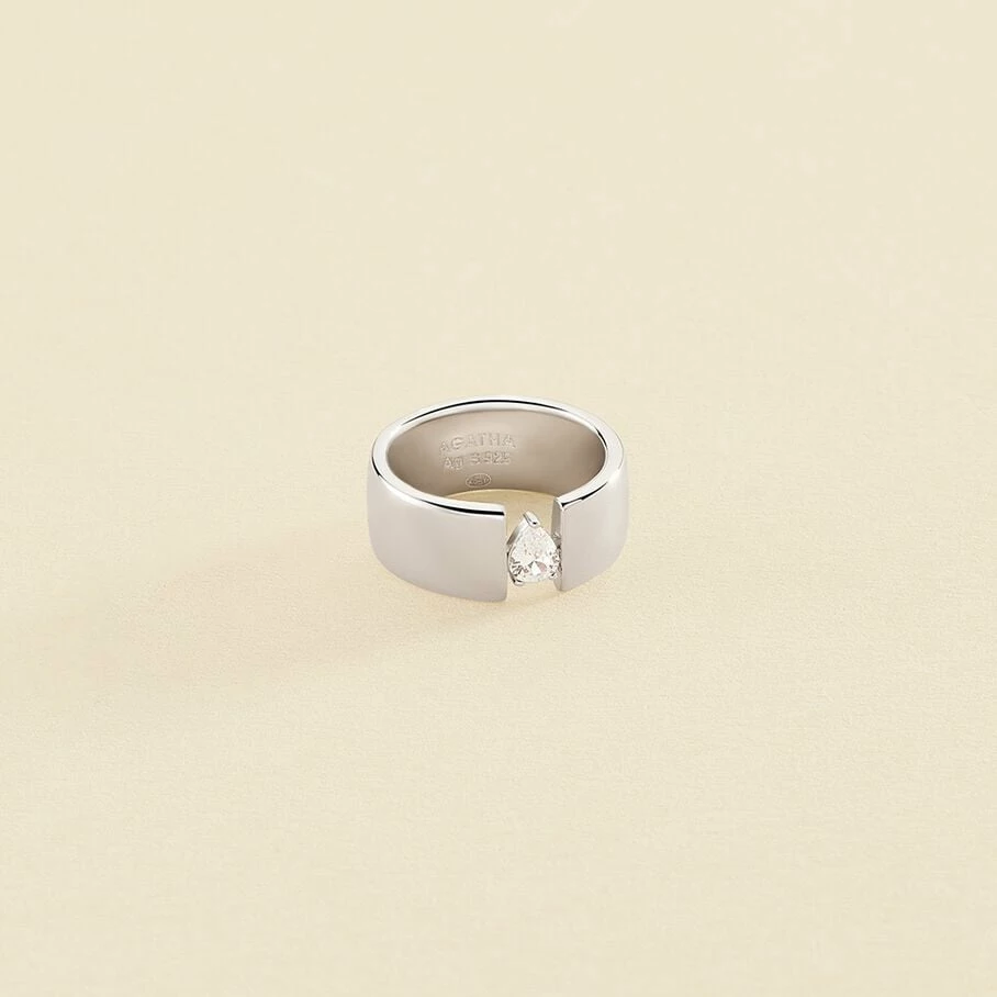 Bague large, en argent véritable, avec un oxyde de zirconium de forme poire enserré dans le corps de bague