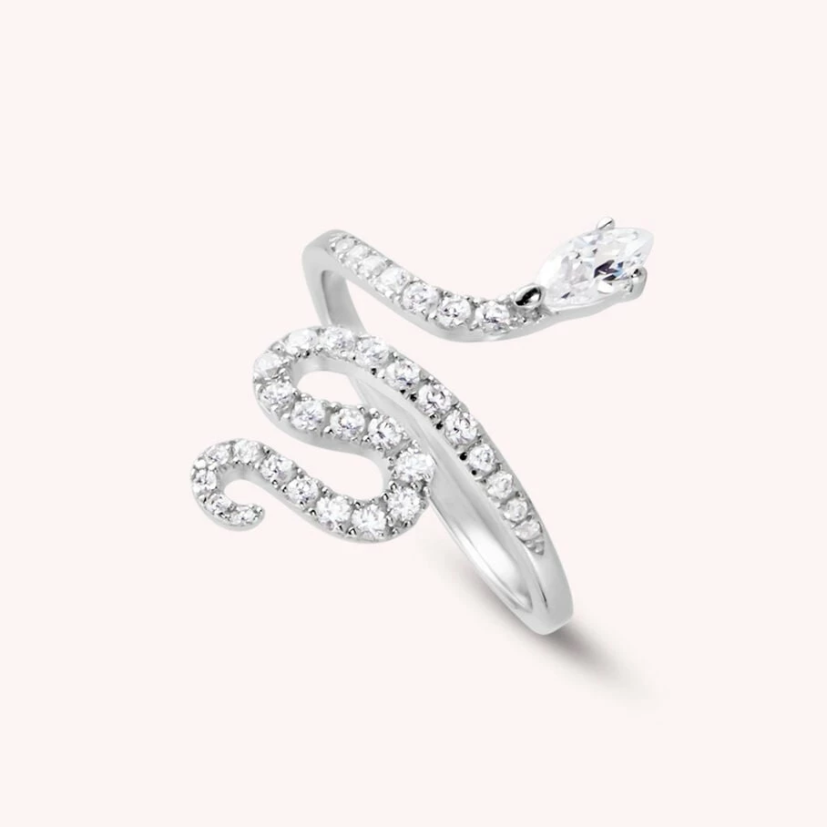 Bague pavée d’oxydes de zirconium, argent véritable, dont la forme évoque celle d’un serpent