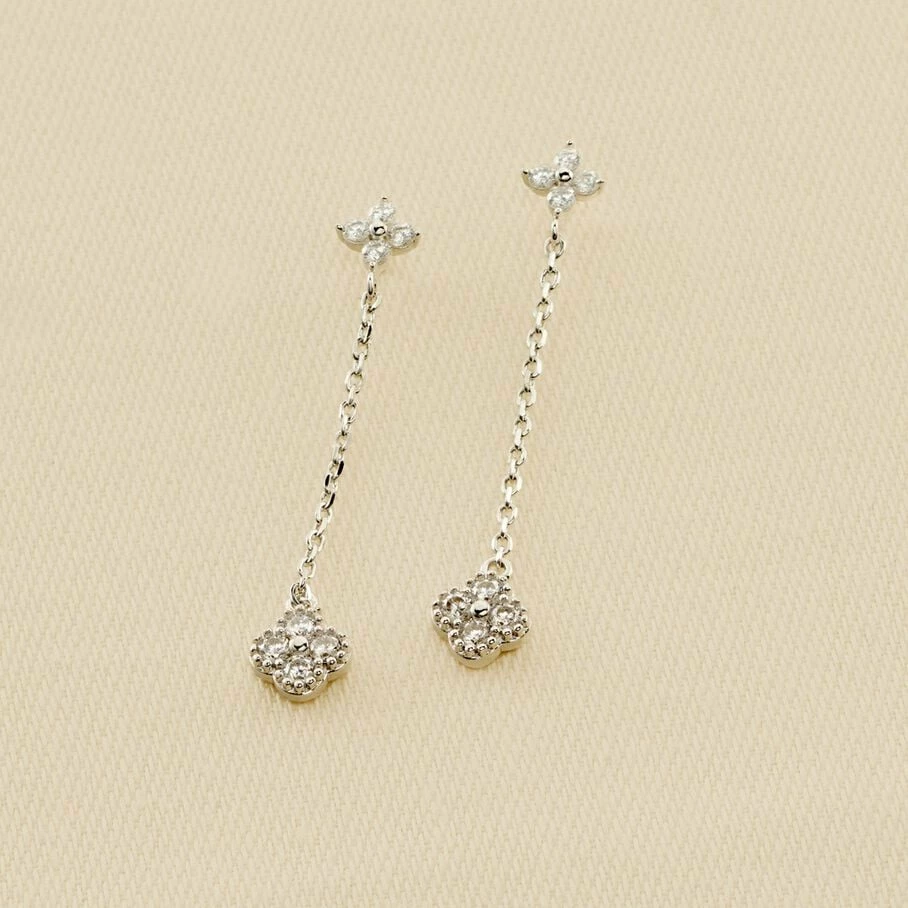 Boucles d’oreilles mi-longues, en argent véritable, constituées de deux fleurs d’oxydes de zirconium et d’un fin graineti sur le pourtour