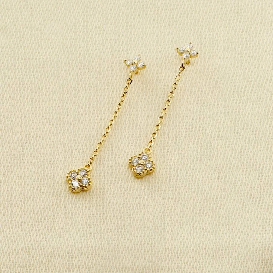 Boucles d’oreilles mi-longues, en argent véritable doré 750/1000, constituées de deux fleurs d’oxydes de zirconium et d’un fin graineti sur le pourtour