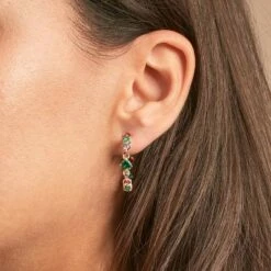 Boucles d’oreilles mi-longues, en argent véritable doré 750/1000, constituées de deux fleurs d’oxydes de zirconium et d’un fin graineti sur le pourtour