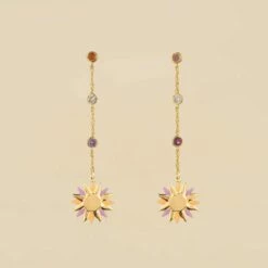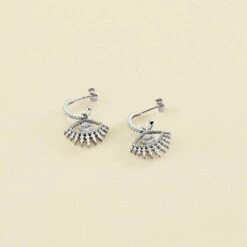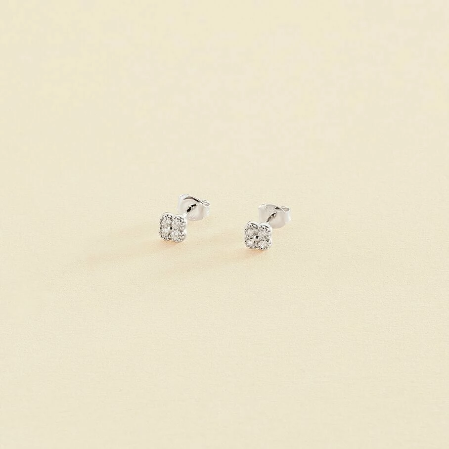Boucles d’oreilles puces, en argent véritable, en forme de fleur dont les pétales sont pavés d’oxyde de zirconium et le pourtour réalisé avec un fin graineti