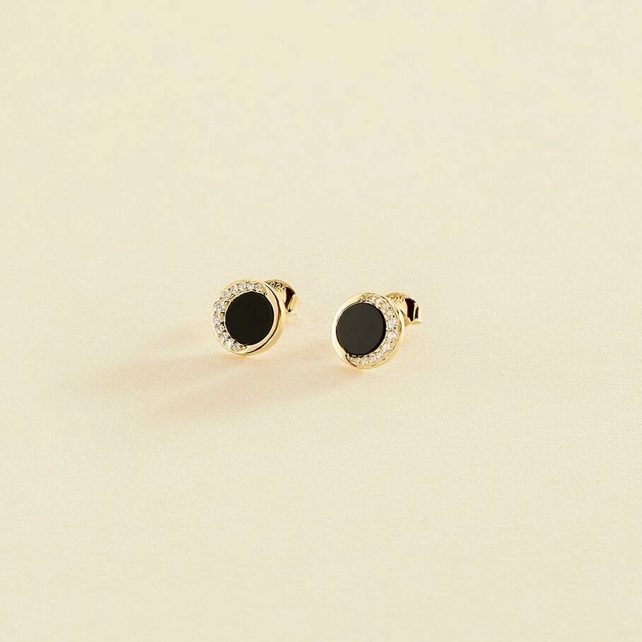 Boucles d’oreilles puces, en argent véritable doré 750/1000, ornées d’une pastille en onyx et d’un motif lune serti d’oxydes de zirconium