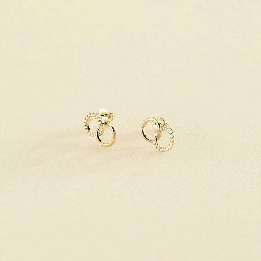 Boucles d’oreilles puces en argent véritable et dorées 750/1000, asymétriques formées de deux anneaux entrelacés dont un pavé d’ oxydes de zirconium