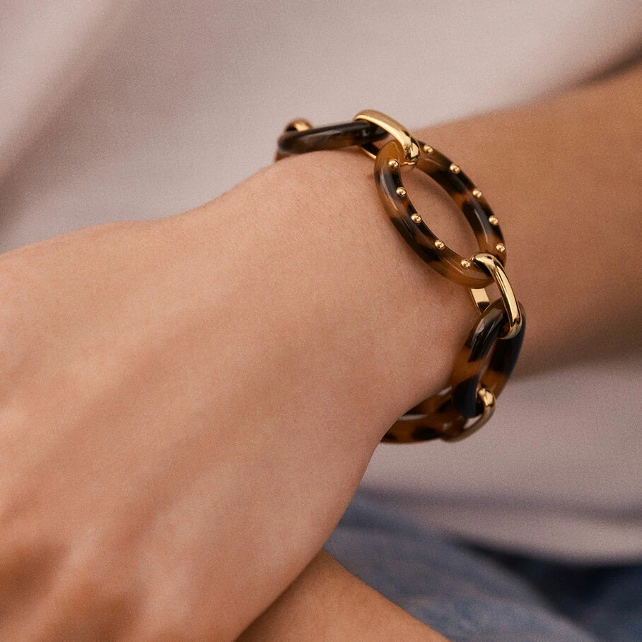 Bracelet en laiton doré 750/1000, avec des maillons ovales en acetate et une boule en métal, fermoir T-bar