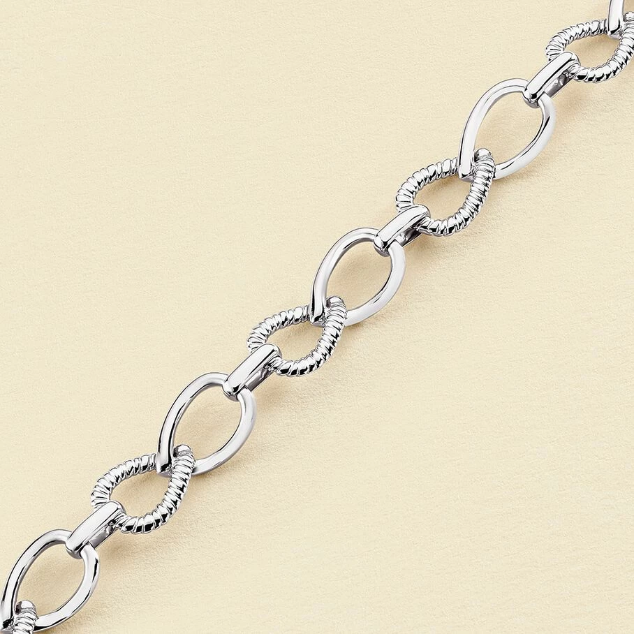 Bracelet, en argent véritable, réalisé avec une maille en forme de gouttes. L’alternance de maillons lisses et torsadés ainsi que le fermoir barette, identitaire à la marque, confère une vraie personnalité à ce bijou
