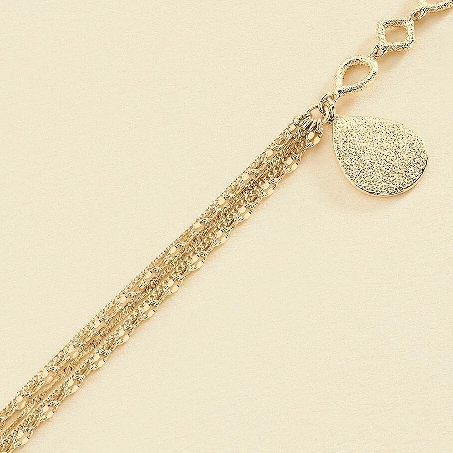 Bracelet, en laiton doré 750/1000, composé de 5 chaines fines. On signe ce bracelet avec un fermoir barrette, si identitaire à la marque et une médaille, en pampille, sur laquelle est gravé une citation positive sur la vie