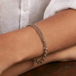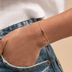 Bracelet elastique, en laiton doré 750/1000, perles de verre enfilées et pompons de chaines