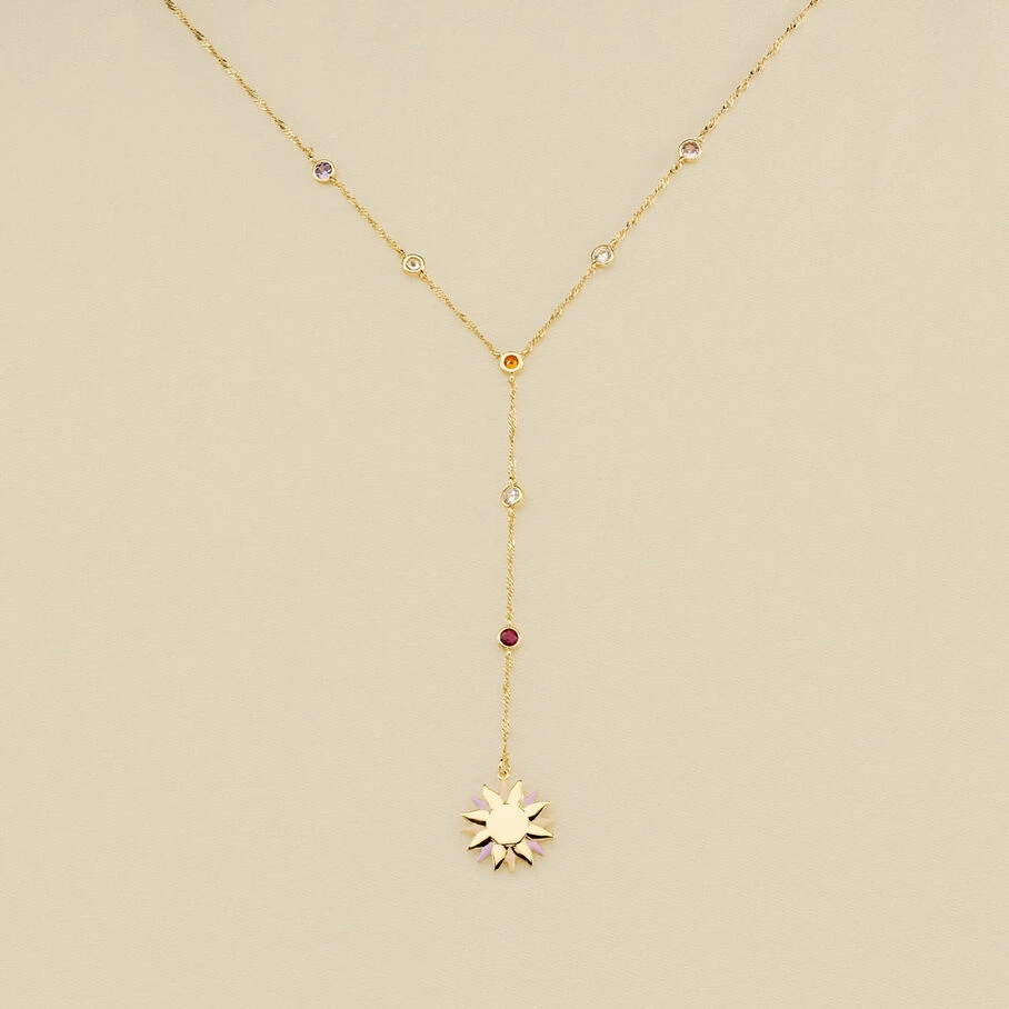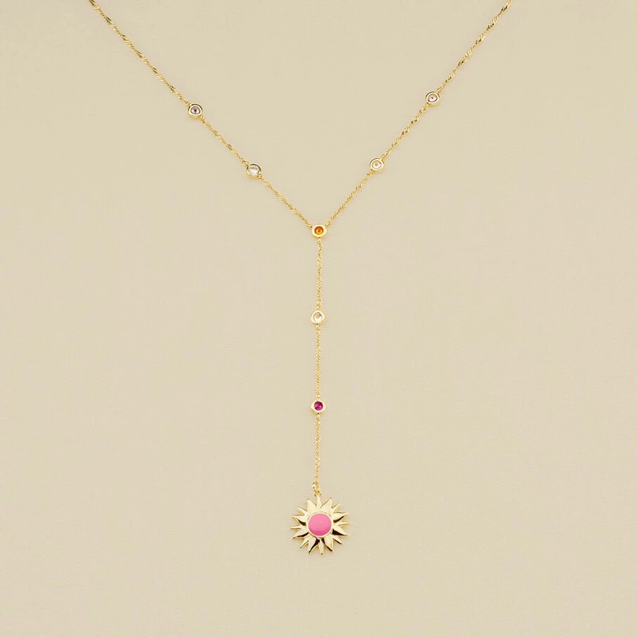 Collier Y, en laiton doré 750/1000, oxydes de zirconium sertis clos sur chaine et soleil émaillé en pendentif au bout de la chaine