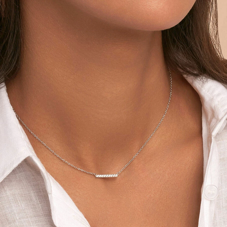 Collier court en argent véritable orné d’une petite barre rigide pavée d’oxydes de zirconium