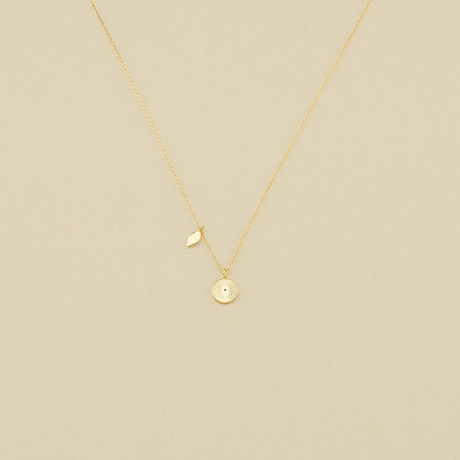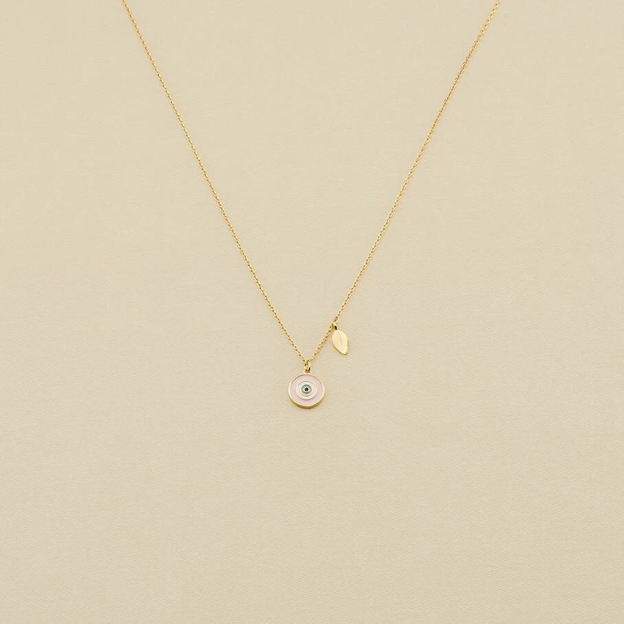 Collier court, en laiton doré à l’or fin, avec un œil turc et un coquillage sur chaine en pendentifs