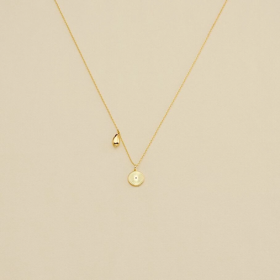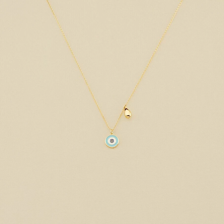 Collier court, en laiton doré à l’or fin, avec un œil turc et un coquillage sur chaine en pendentifs