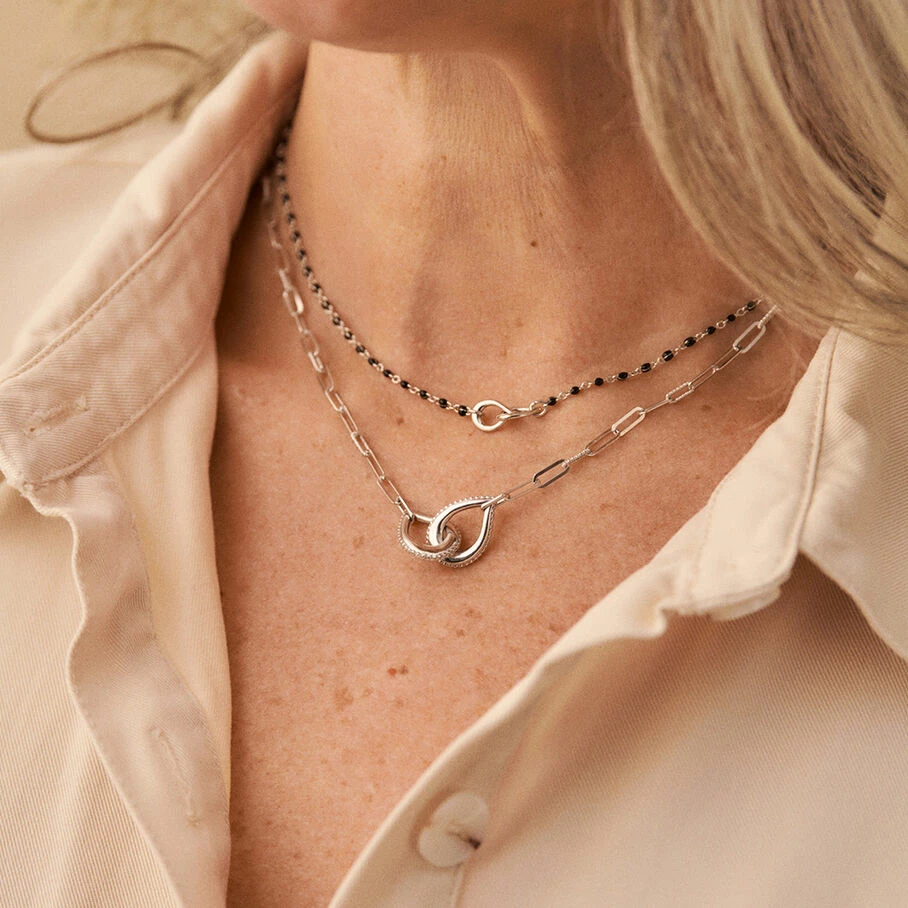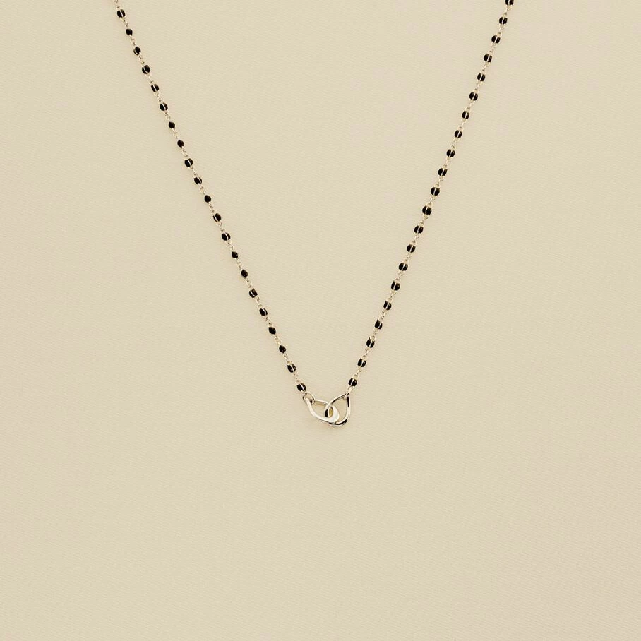 Collier court, laiton, perles d’émail sur chaîne et 2 anneaux gouttes entrelaçés