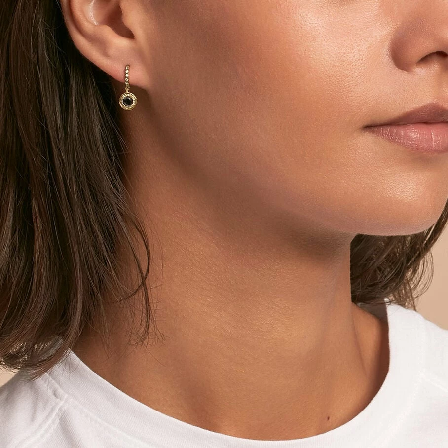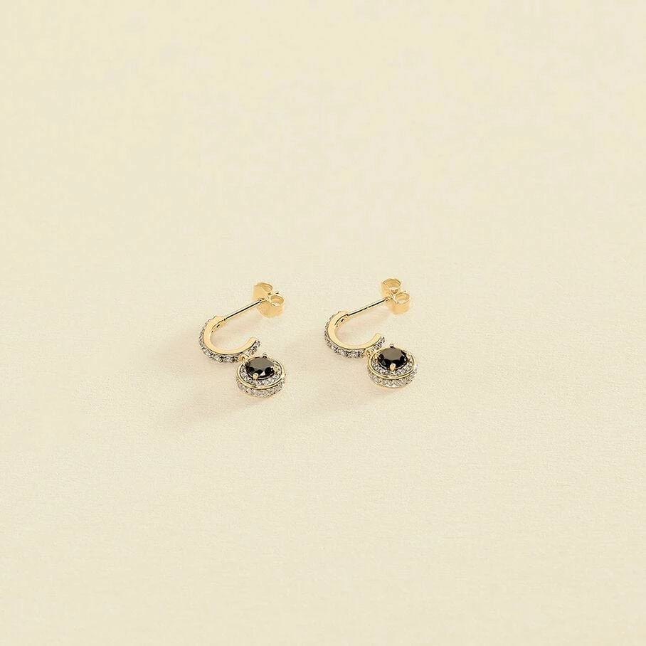 Créoles, en argent véritable doré 750/1000, avec, en breloque, un mini oxyde rond autour duquel sont micro sertis des oxydes de zirconium