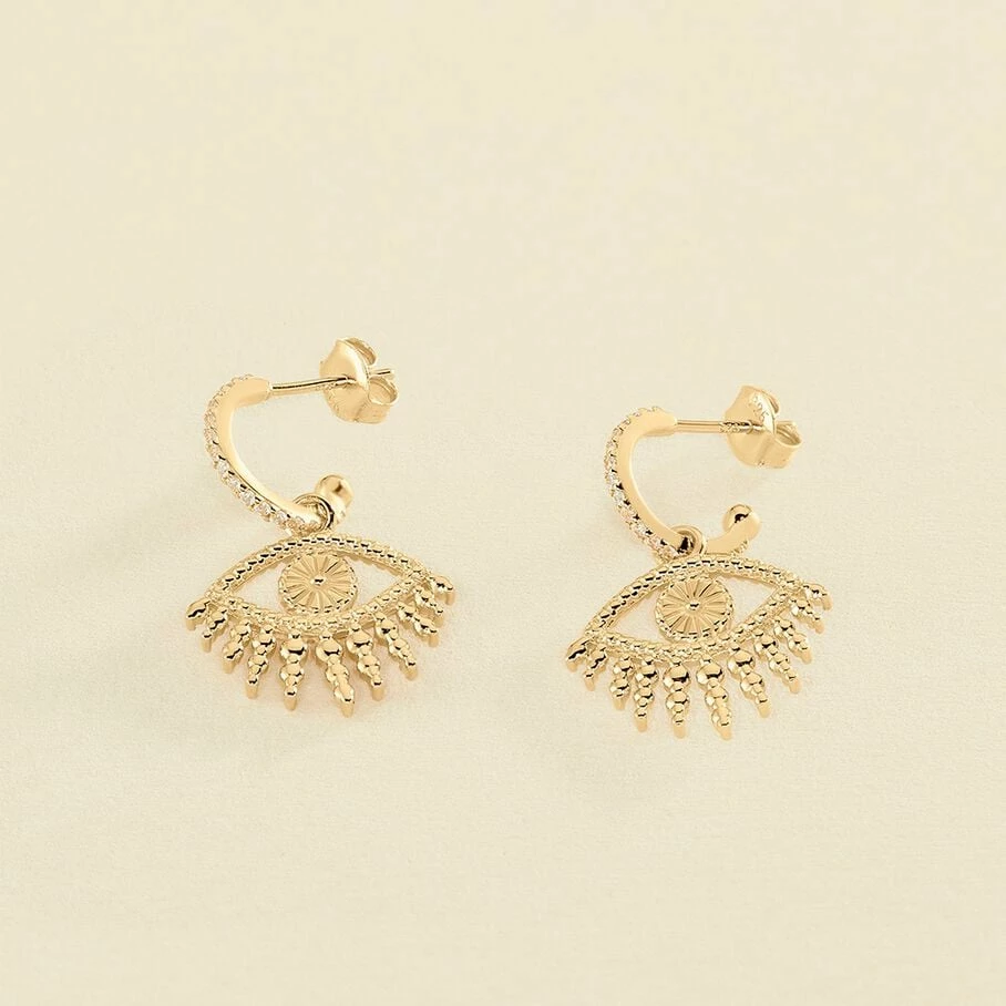 Créoles de 14mm de diamètre, en argent véritable 925/1000 et dorées 750/1000, sur lesquelles un œil turc a été ajouté en breloque. L’iris émaillé et le contour de l’œil serti d’oxydes de zirconium apportent un vrai raffinement et éclat au produit! Au besoin la breloque peut se retirer pour un look déparaillé ou encore un look plus simple avec de petites créoles serties d’oxydes de zirconium seulement. Des boucles d’oreilles 3 en 1 à porter au gré de vos tenues et humeur!