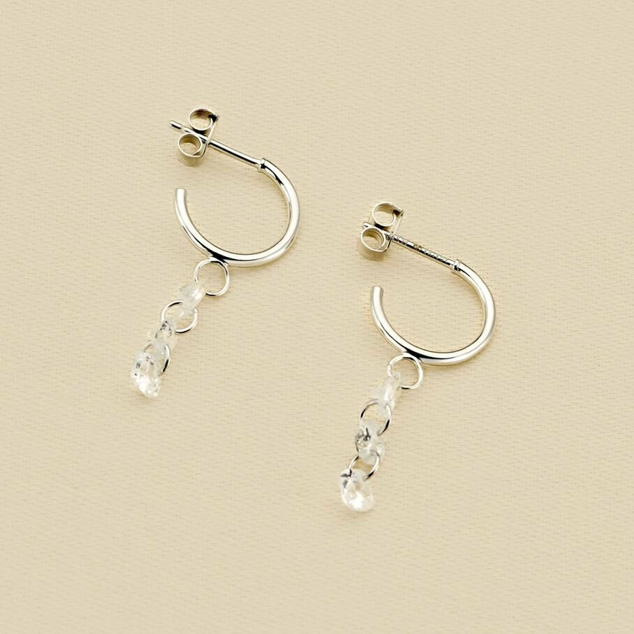 Créoles de 12 mm de diamètre, en argent véritable, avec une trilogie d’oxydes de zirconium percés en formes de poire, rond et coussin, en pampille