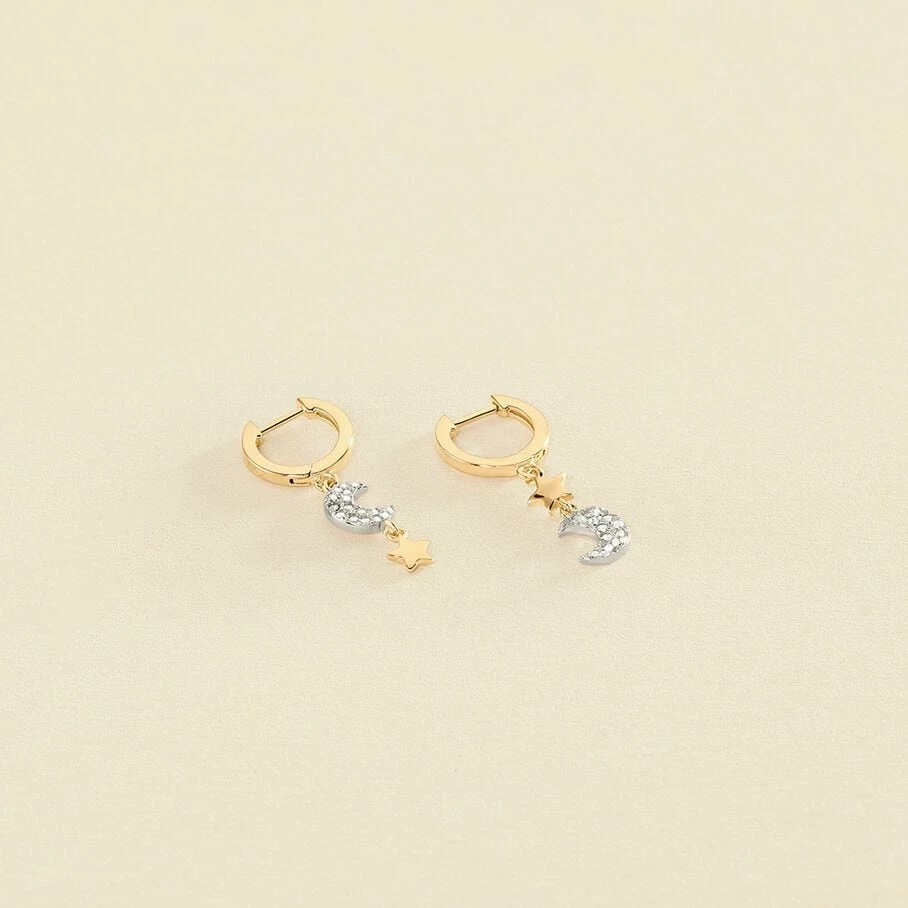 Créoles, en argent véritable doré 750/1000, avec une lune et une étoile en pendentif