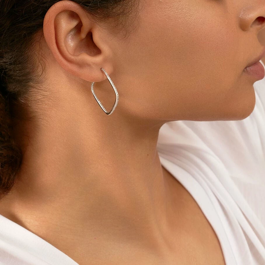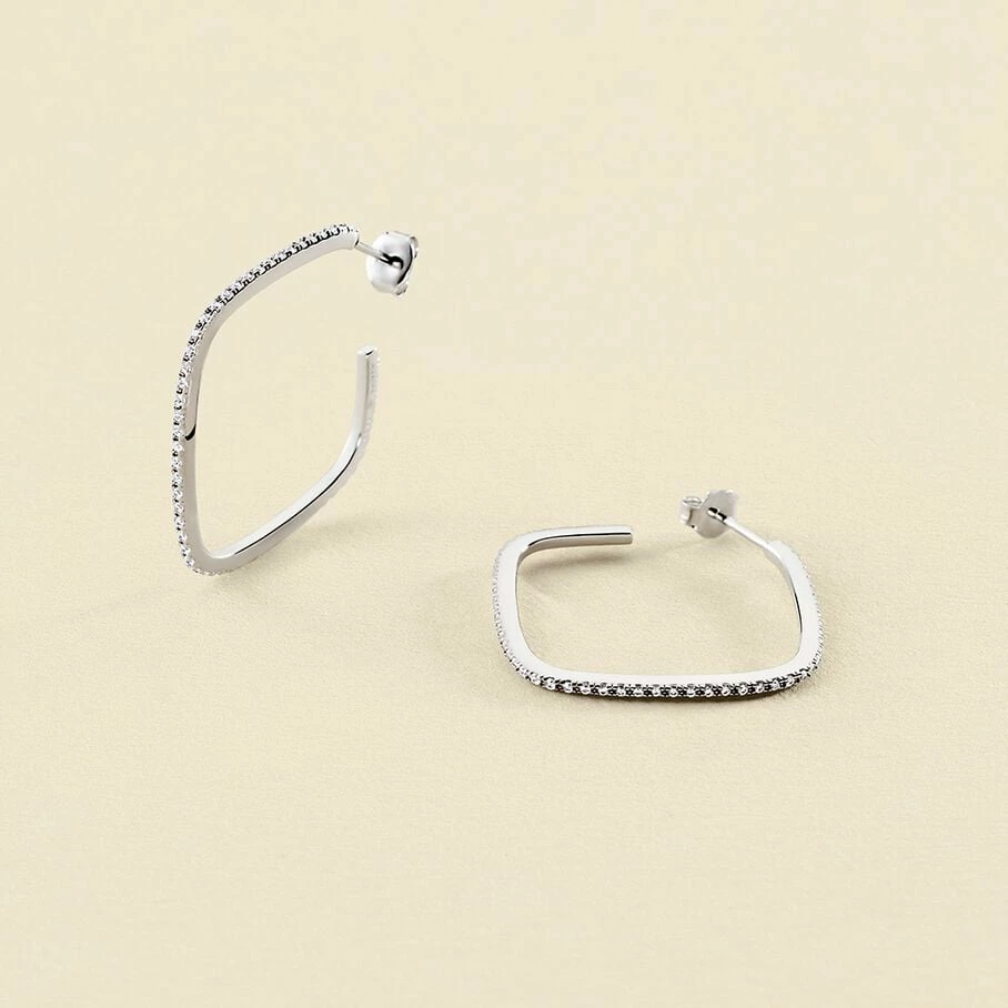 Créoles portées de face, carrés ajourés et pavés d’oxydes de zirconium, en argent véritable.