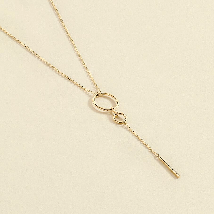 Collier Y, en argent véritable doré 750/1000, avec une fine chaîne sur laquelle sont montés deux anneaux évidés de différentes tailles